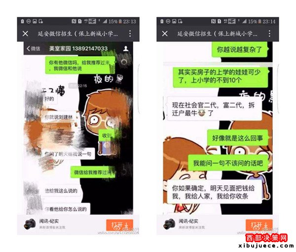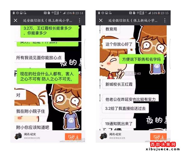 近日,一則題為《延安微信招生(3.2萬保上新城小學)請相關(guān)部門給予調(diào)查公布真相》的帖子在朋友圈瘋傳,內(nèi)容是一位微信名叫“延安微信招生(保上新城小學)”的微友,聲稱只要花3.2萬元,保證可以在新區(qū)小學入學,并解釋有中間人,錢并不是直接給校長王紅霞,但愿意提供自己的車號、身份證號、家庭住址等信息作為擔保。3.2萬真的能夠保上延安新區(qū)小學嗎?事情真相究竟如何,記者展開調(diào)查。