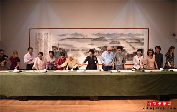 在觀看“意象中國(guó)”書(shū)畫(huà)展時(shí),彭麗媛和來(lái)賓們?cè)凇段飨o(jì)勝圖》、《朱荷圖軸》等經(jīng)典國(guó)畫(huà)作品前駐足觀看,接著欣賞4位著名書(shū)畫(huà)家現(xiàn)場(chǎng)聯(lián)袂創(chuàng)作書(shū)畫(huà)作品《江南憶》。一位書(shū)法家還為來(lái)賓們現(xiàn)場(chǎng)示范毛筆的執(zhí)筆、運(yùn)筆方式。彭麗媛邀請(qǐng)來(lái)賓們一同書(shū)寫(xiě)漢字“和”。她說(shuō),“和”字在漢語(yǔ)里具有“和平”、“和諧”之義,是我們對(duì)世界的共同心愿。來(lái)賓們饒有興致地拿起毛筆各自書(shū)寫(xiě),并展示自己的書(shū)法作品。彭麗媛說(shuō),昨晚各位在西湖邊觀看了精彩的文藝演出,今天我們?cè)谶@里一同欣賞畫(huà)中的西湖。她同來(lái)賓們?cè)趪?guó)畫(huà)《西湖秋勝》前合影留念。