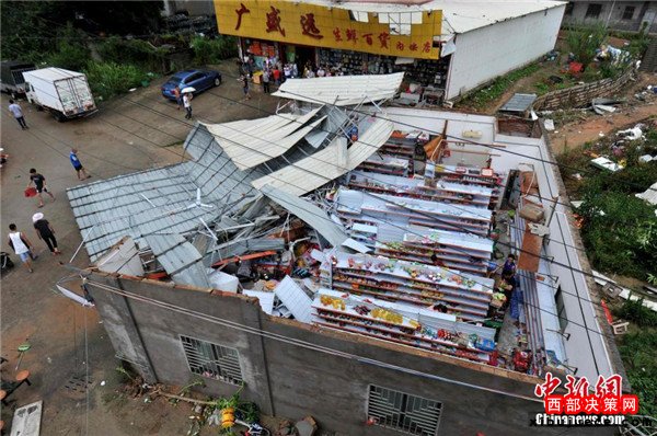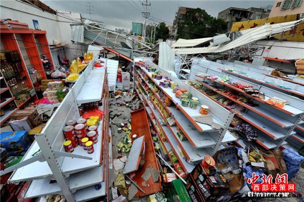 9月15日,今年第14號臺風“莫蘭蒂”于凌晨3時05分在廈門翔安區(qū)沿海登陸,登陸時中心附近最大風力15級(48米/秒,強臺風級),中心氣壓945百帕,給翔安當地帶來嚴重損失。圖為翔安一超市被摧毀。