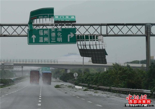 翔安境內公路路牌被吹飛。