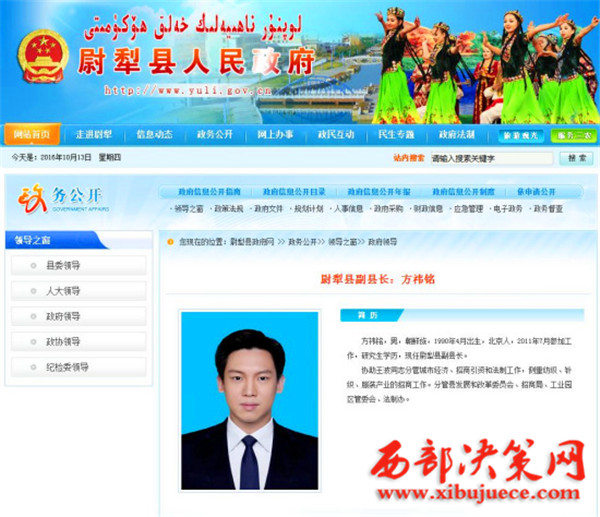 尉犁縣官網(wǎng)上公布的方祎銘簡歷