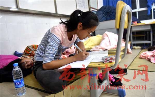 10月18日,在欽州市的臨時(shí)安置所內(nèi),高一學(xué)生廖凌在寫作業(yè)。