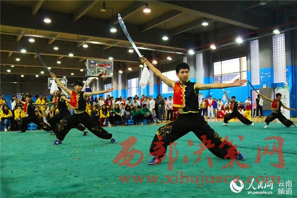 10月22日,云南師范大學(xué)體育學(xué)院的學(xué)生們手持單刀、木棍、長(zhǎng)槍等,為參加第九屆“漢語橋”世界中學(xué)生中文比賽的海外選手表演了精彩的中華傳統(tǒng)武術(shù)。一些參賽選手也摩拳擦掌,登臺(tái)獻(xiàn)藝,與云南師范大學(xué)的學(xué)生們互相切磋,引得現(xiàn)場(chǎng)一片喝彩。
