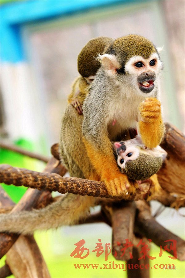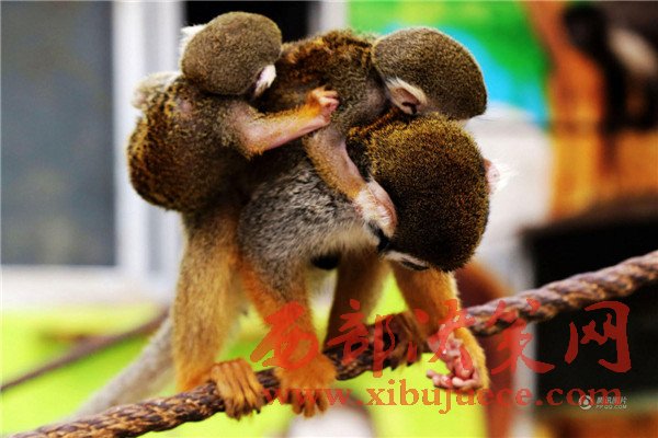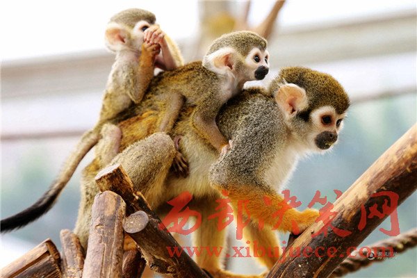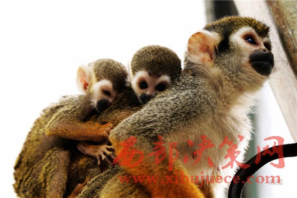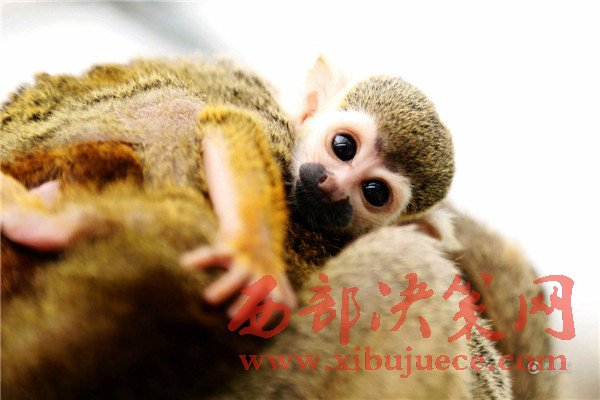 無(wú)論走到哪里松鼠猴都讓這個(gè)小家伙和自己的寶寶一起趴在自己背上玩耍、休息。
