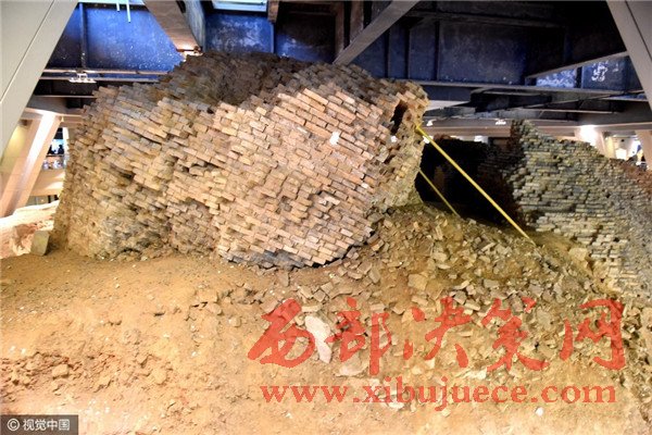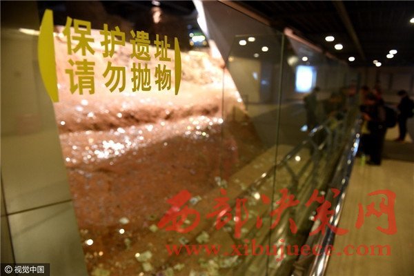 而就在游客身邊的玻璃墻上,赫然寫著“保護遺址,請勿拋物”8個大字。