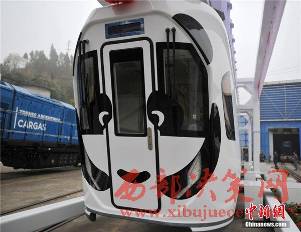 記者在現(xiàn)場(chǎng)看到,正式下線的空鐵車(chē)身為卡通熊貓山水圖案,酷似“熊貓”,每列定員144人,時(shí)速最高可達(dá)65公里。列車(chē)采用“大容量動(dòng)力蓄電池充放電控制技術(shù)”,通過(guò)實(shí)現(xiàn)高倍率放電,提高列車(chē)起動(dòng)加速性能及對(duì)極限環(huán)境的適應(yīng)性,同時(shí)能將400千瓦的電制動(dòng)功率全部用于動(dòng)力電池快速充電,實(shí)現(xiàn)制動(dòng)能量回收再利用,延長(zhǎng)蓄電池續(xù)航里程達(dá)120千米。圖為車(chē)身外繪制有熊貓山水圖案。