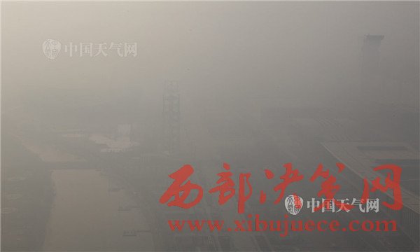 2016年12月19日早晨,北京持續(xù)空氣重污染。記者登上246.8米高的北京奧林匹克塔,鳥(niǎo)瞰北京城,發(fā)現(xiàn)咫尺之遙的鳥(niǎo)巢、水立方等奧運(yùn)場(chǎng)館和城市地標(biāo)建筑被霾“吞沒(méi)”,消失不見(jiàn)。圖為鳥(niǎo)巢。