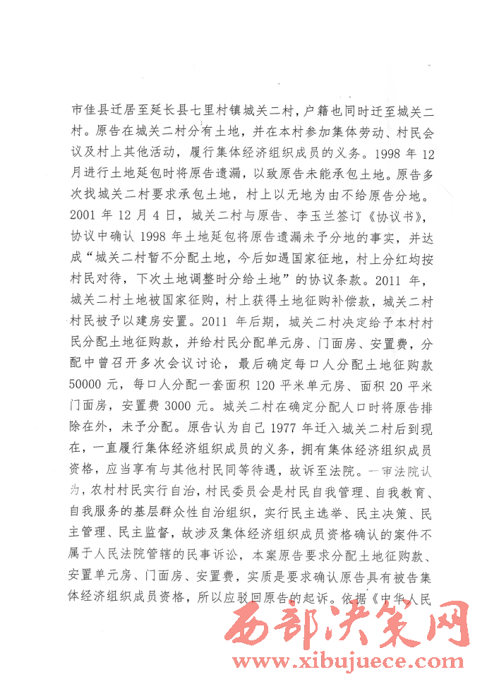 西部決策網(wǎng)訊記者 封營庫 實(shí)習(xí)記者 李延梅)陜西延長縣七里村村民李果花反映稱:“1977年我從榆林市佳縣遷居至延長縣七里村鎮(zhèn)城關(guān)二村,戶籍也同時(shí)遷至城關(guān)二村。我在城關(guān)二村分有土地,并在本村參加集體勞動(dòng)村民會(huì)議及村上其它活動(dòng),履行集體經(jīng)濟(jì)組織成員的義務(wù)。1998年12月進(jìn)行土地延包時(shí)將我遺漏,以致我未能承包土地。我多次找城關(guān)二村要求承包土地,村上以無地為由不給我分地。2001年12月4日,城關(guān)二村與我、李玉蘭簽訂《協(xié)議書》,協(xié)議中確認(rèn)1998年土地延包時(shí)將我遺漏未有分地的事實(shí),并達(dá)成“城關(guān)二村暫不分配土地,今后如遇國家征地,村上分紅均按村民對待,下次土地調(diào)整時(shí)分給土地”的協(xié)議條款。2011年,城關(guān)二村土地被國家征購,村上獲得土地征購補(bǔ)償款,城關(guān)二村村民被予以建安置房。2011年后期,城關(guān)二村決定給予本村村民分配土地征購款,并給村民分配單元房、門面房、安置費(fèi),分配中曾召開多次會(huì)議討論,最后確定每口人分配土地征購款50000元,每口人分配一套面積120平米單元房,面積20平米的門面房,安置費(fèi)5000元,城關(guān)二村在確定人口時(shí)將我排除在外,未予分配。我認(rèn)為自己1977年遷入城關(guān)二村后到現(xiàn)在,一直履行集體經(jīng)濟(jì)組織成員的義務(wù),擁有集體經(jīng)濟(jì)組織成員資格,應(yīng)當(dāng)享有與其他村民同等待遇,故訴至延長縣人民法院要求判令城關(guān)二村給予我分配土地征購款50000元,安置單元房一套(120平米)、門面房20平米,安置過渡費(fèi)5400元。但被延長縣人民法院以涉及集體經(jīng)濟(jì)組織成員資格的案件不屬于人民法院管轄的民事訴訟,駁回起訴。我又上訴至延安市中級人民法院,但又用同樣的理由又被駁回上訴。我該怎么辦?真的天下烏鴉一般黑嗎?我訴訟的是要回屬于我的征地款、安置房、過渡費(fèi),我有合法的戶口簿、身份證。又有延長縣城關(guān)鎮(zhèn)政府副鎮(zhèn)長張世杰、包村片長趙華強(qiáng)、包村干部白醫(yī)學(xué)、城關(guān)村村主任(二村村民)董志軍、二村村長趙金星,原二村會(huì)計(jì)王連平,原二村代表老村長丁興元,在鎮(zhèn)政府會(huì)議室簽訂的協(xié)議書。難道我的村民資格還要確認(rèn)嗎?我村村長董志軍的兒子董飛戶口也不在我村,又是公務(wù)員,現(xiàn)任延長縣紀(jì)律檢查委員會(huì)案件審理室主任,還有村長董志軍他父親。董長春早已去世,但也同樣分的征地補(bǔ)償款,安置單元房,安置過渡費(fèi)。望你們新聞媒體深入調(diào)查,將事實(shí)公布于眾,為我申冤,維護(hù)我的合法權(quán)益。”
