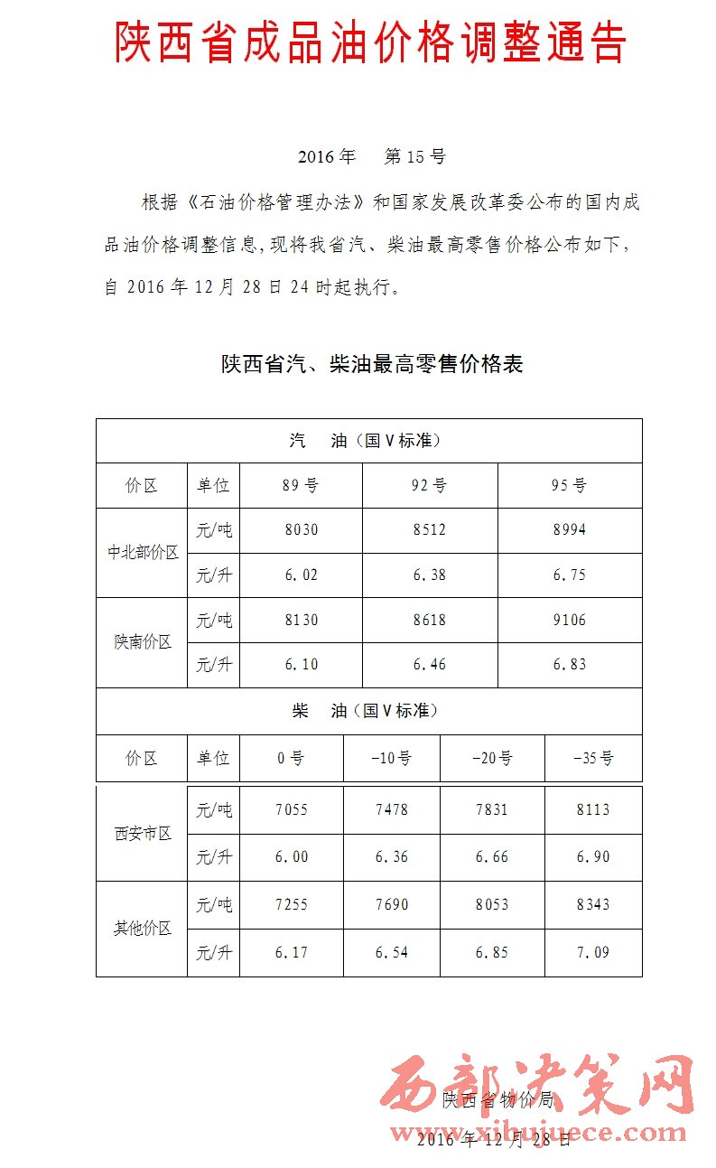 根據(jù)《石油價格管理辦法》和國家發(fā)展改革委公布的國內(nèi)成品油價格調(diào)整信息,陜西省2016年12月28日24時起執(zhí)行最新的汽、柴油價格,并給出了最高零售價。