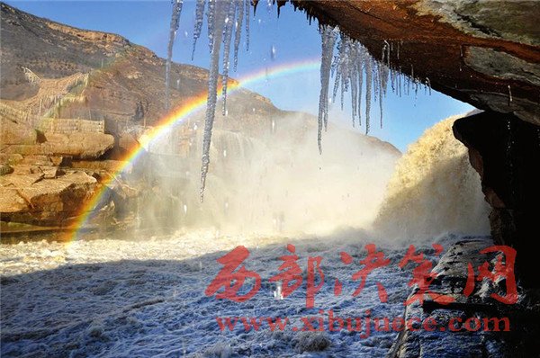 黃河壺口瀑布冰掛晶瑩剔透與彩虹交相輝映 景色稱奇