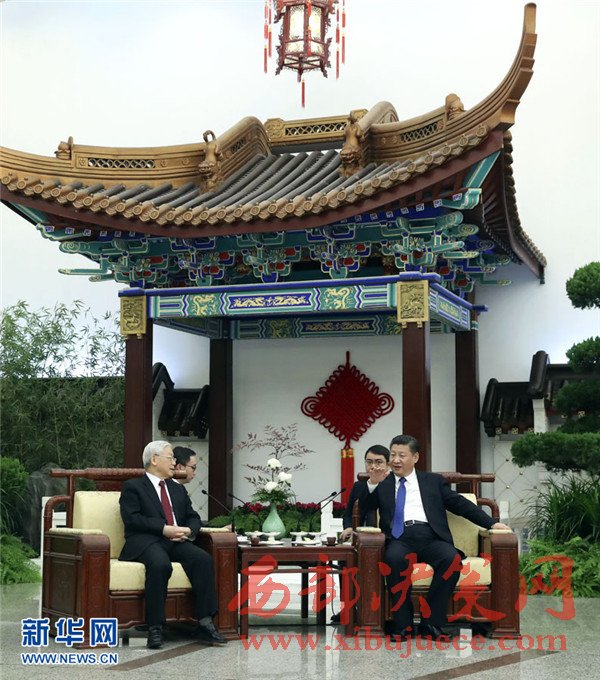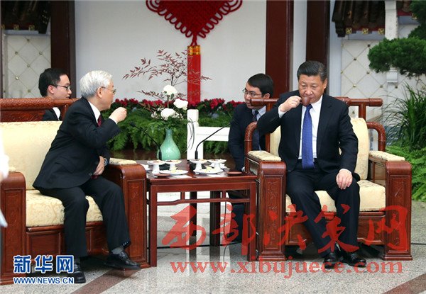 1月12日,中共中央總書(shū)記、國(guó)家主席習(xí)近平在北京人民大會(huì)堂同越共中央總書(shū)記阮富仲舉行會(huì)談。這是會(huì)談后,兩黨總書(shū)記進(jìn)行茶敘。