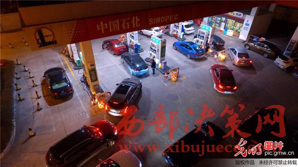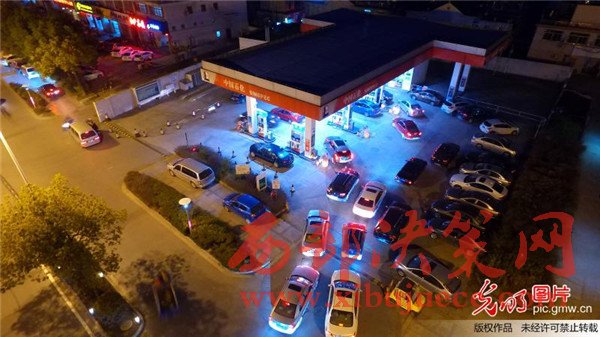 2017年1月12日晚,航拍揚(yáng)州一家加油站,車主排隊(duì)等待加油。