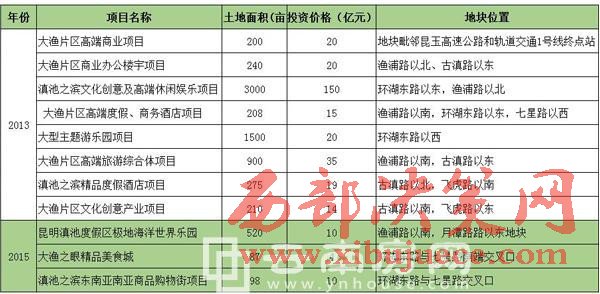 首先是2013年7月,昆明滇池國(guó)家旅游度假區(qū)一次性發(fā)布了8個(gè)項(xiàng)目的招商信息,總占地面積6533畝,總投資額預(yù)計(jì)約293億元。2015年7月,昆明滇池國(guó)家旅游度假區(qū)又發(fā)布了3個(gè)項(xiàng)目的招商信息,總占地面積705畝,總投資額預(yù)計(jì)約24億元。除了大批量的項(xiàng)目統(tǒng)一招商之外,另有部分項(xiàng)目也在陸陸續(xù)續(xù)的招商推進(jìn)中,但因旅游項(xiàng)目開(kāi)發(fā)投資題量大、建設(shè)周期長(zhǎng)、回報(bào)慢等制約因素,大漁片區(qū)開(kāi)發(fā)多年以來(lái)落地項(xiàng)目卻寥寥無(wú)幾。除了大漁欣城,在建的倚瀾苑項(xiàng)目,再無(wú)其他項(xiàng)目有實(shí)質(zhì)性進(jìn)展。