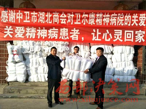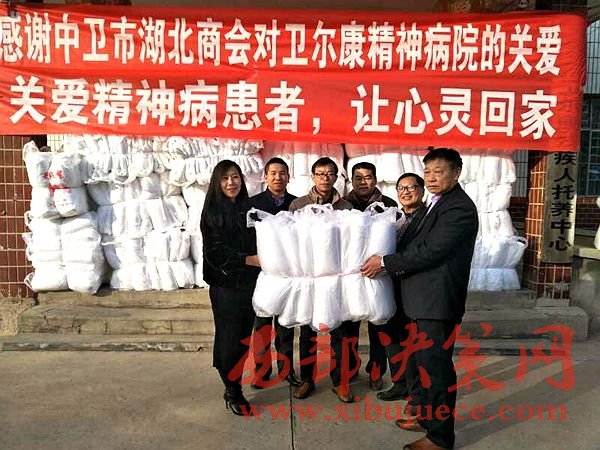 西部決策網(wǎng)訊(黃貞  楊新)2017年1月9日,中衛(wèi)市湖北商會一行數(shù)人在會長朱秀東的帶領(lǐng)下,前往中衛(wèi)市衛(wèi)爾康精神病醫(yī)院進(jìn)行新年前慰問,并送去價值2萬余元的過冬棉被。