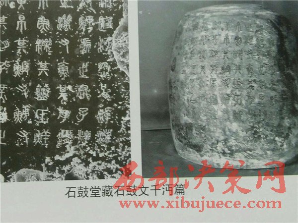 曹老早在40多年前就潛心鉆研石鼓。唐627年,陜西寶雞岐山北坡的荒郊首次發(fā)現(xiàn)石鼓。此地曾是秦朝舊地。共十枚,髙約2尺,徑約3尺,分別刻有大篆四言詩(shī)一首,共十首,計(jì)718字。定名:車工、千沔、田車、鑾車、霝雨、乍原、吳人、而師、馬薦、吾水。內(nèi)容最早被認(rèn)為是記敘周宣王出獵的場(chǎng)面,后有專家論證為秦時(shí)記敘游獵的遺物,故稱“獵碣”。