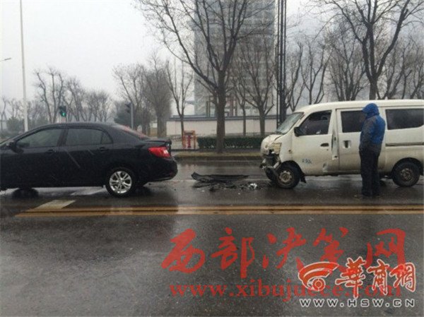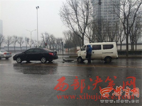 西安降雪,緩解了霧霾天氣,不過雪天路滑,給司機(jī)行車帶來不少麻煩。昨日下午2時(shí)50分許,在西安市雁翔路一處丁字路口,一輛白色面包車因紅燈剎車不及,撞上了前面停車等紅燈的一輛黑色私家車,造成車頭損毀,所幸兩車司機(jī)均未受傷。提醒司機(jī)朋友,雨雪天氣路面濕滑,請(qǐng)謹(jǐn)慎行駛,注意保持安全車距,以免發(fā)生意外。