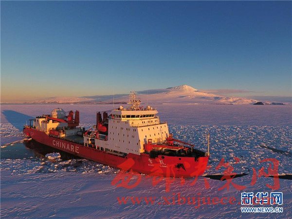 2月11日,“雪龍”船停泊在麥克默多灣,遠(yuǎn)處是海拔3794米的埃里伯斯火山。