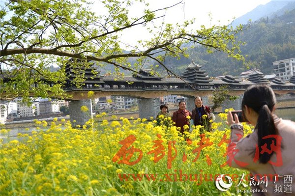 春暖花開時(shí)節(jié),廣西龍勝各族自治縣民族風(fēng)雨橋旁的油菜花競(jìng)相綻放,風(fēng)雨橋在油菜花的點(diǎn)綴下美不勝收,形成了一道美麗的春天景致,充滿著濃郁的春天氣息,吸引眾多游客前來觀賞拍照。