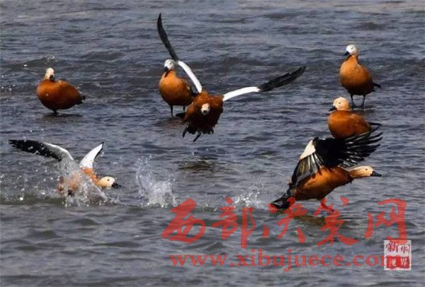 水禽在松花江吉林市段水面上嬉戲。