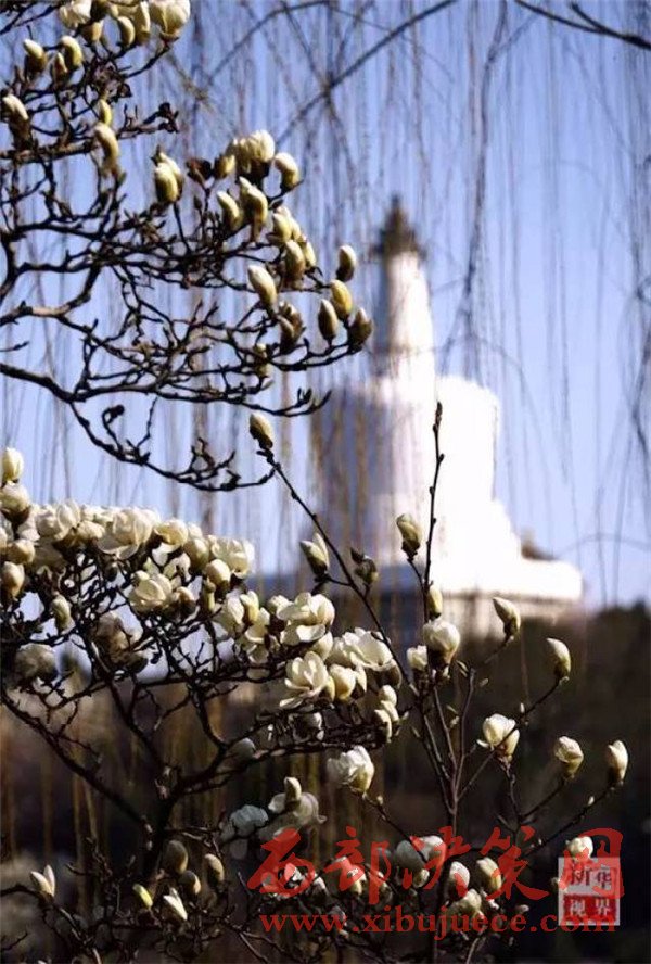 北海公園的白塔和盛開(kāi)的玉蘭花