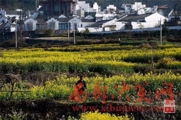 一名村民在安徽省黃山市黟縣盧村的油菜花田里勞作。