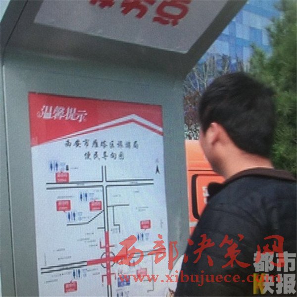 西安小寨街頭出現(xiàn)便民導(dǎo)廁神器,還能給手機(jī)充電。