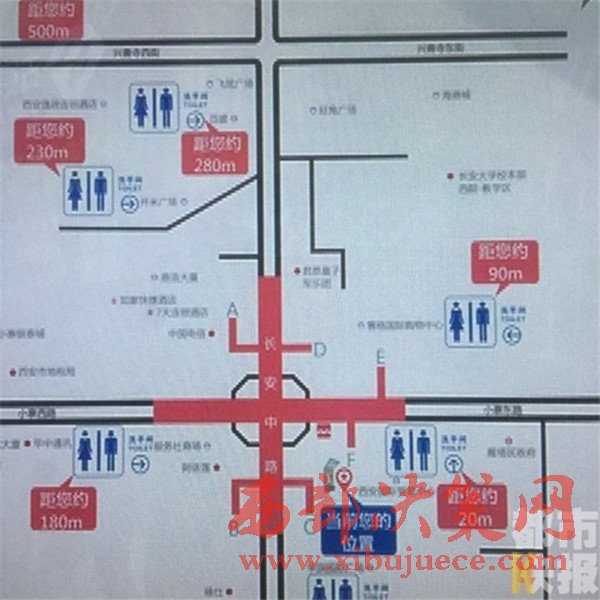 在這個(gè)指示牌的地圖上,除了標(biāo)注出“所在位置”以及周邊的標(biāo)志性地點(diǎn),還醒目的標(biāo)出了周?chē)男l(wèi)生間地點(diǎn)。圖上標(biāo)明,在小寨十字,周?chē)还灿衅邆€(gè)可用衛(wèi)生間,最遠(yuǎn)的一個(gè)距離280米,最近的一個(gè)距離只有20米。