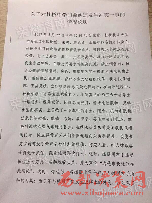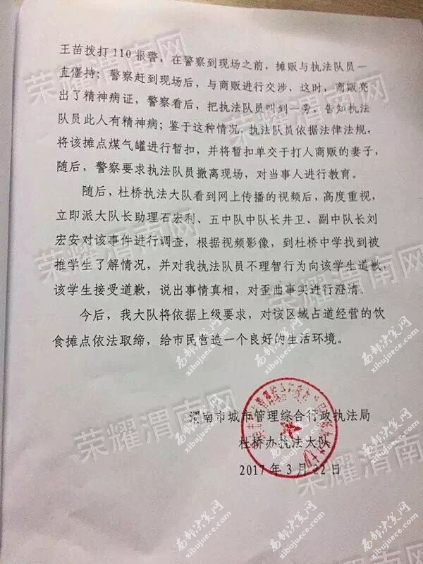 當晚6點以后,涉事執(zhí)法隊員所屬執(zhí)法大隊杜橋執(zhí)法大隊書面回復便在網絡中被網友們不斷的轉載。據(jù)該回復稱:2017年3月22日中午12時40分左右,杜橋執(zhí)法大隊市容機動中隊謝鵬、朱勇、康忠民、王苗等4名執(zhí)法隊員在杜橋中學門前取締占道經營飲食攤點,當時有八個攤點在此經營,七個已勸離,其中一戶不愿離開,與執(zhí)法隊員康忠民發(fā)生言語沖突,在康忠民要求其搬離此處,禁止銷售時,攤點經營者情緒激動,突然,用鋼管圓凳子砸向執(zhí)法隊員康忠民,致使康忠民胳膊、背部等多處軟組織損傷,執(zhí)法隊員謝鵬、王苗等見狀,立即趕到康忠民處進行勸導,在勸導過程中,杜橋中學一名學生說城管打人,不明真相的約五六十名學生一起起哄、謾罵城管,因康忠民被打,情緒比較激動,見學生歪曲事實,上前推了一下起哄的學生,隨后,機動中隊執(zhí)法隊員朱勇、陳新亮、魏楠、徐嬌、姜寧寧、孫偉珍趕到現(xiàn)場,準備對該攤點煤氣罐進行暫扣,在執(zhí)法隊員朱勇關閉液化氣罐閥門時,攤點經營者用鋼管圓凳砸向朱勇手臂處,致使朱勇左前臂及手背部多處軟組織損傷,打完人后,打人攤販妻子將凳子抓住,阻止攤販再次打人,這時,攤販用左手抓起攤位上的刀具,威脅城管隊員,并大聲說“這是市長讓他在此擺攤”,這時,旁邊另一名攤販上前奪取打人攤販左手所持的刀具;為了不與攤販再次發(fā)生肢體上的沖突,執(zhí)法隊員王苗撥打110報警,在警察到現(xiàn)場之前,攤販與執(zhí)法隊員一直僵持;警察趕到現(xiàn)場后,與商販進行交涉,這時,商販亮出了精神病證,警察看后,把執(zhí)法隊員叫到一旁,告知執(zhí)法隊員此人有精神病;鑒于這種情況,執(zhí)法隊員依據(jù)法律法規(guī),將該攤點煤氣罐進行暫扣,并將暫扣單交于打人商販的妻子,隨后,警察要求執(zhí)法隊員撤離現(xiàn)場,對當事人進行教育。