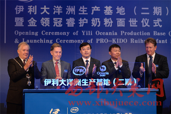伊利集團(tuán)董事長兼總裁潘剛(左三)與中國駐新西蘭大使館參贊張帆(右二)、新西蘭駐華使館商務(wù)投資參贊IvanKinsella(左二)、新西蘭懷馬特市市長CraigRowley(左一)、大洋洲乳業(yè)總經(jīng)理Roger(右一)共同為伊利大洋洲生產(chǎn)基地(二期)揭牌。