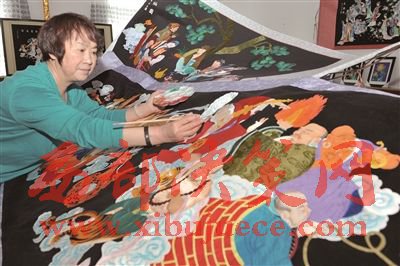 現(xiàn)任青海省民間工藝美術(shù)大師、國家非物質(zhì)文化遺產(chǎn)湟中堆繡的青海省代表性傳承人、湟中縣堆繡協(xié)會會長的喬應(yīng)菊,自幼酷愛民間工藝,三十年前經(jīng)塔爾寺三絕藝術(shù)之一的堆繡老藝僧智華恩師的傳授,她執(zhí)著追求,苦學(xué)至今,形成了她特有的堆繡造型和配色特色。她對記者說:“堆繡是一種運(yùn)用‘剪’、‘堆’技法塑造的獨(dú)特藝術(shù),用各色質(zhì)地不同的綢緞剪出人物、花鳥、山水等各種圖案,再根據(jù)設(shè)計(jì)需求逐一堆貼在黑色底子的大幅布幔上,形成了一個(gè)完整的畫面。堆繡分為‘平剪堆繡’和‘立體堆繡’,前者是將各色布料堆貼在事先設(shè)計(jì)好的圖案上,用彩線或金銀線鑲邊而成;后者則是用各色綢緞剪成佛像、人物、花卉等多種圖形,然后充塞羊毛或棉花,再用絲線繡織。堆繡整體圖案極富有立體感,人物形象逼真,畫面色調(diào)和諧,產(chǎn)生出豐富而生動的立體感和織物特有的肌理感,具有浮雕式的藝術(shù)效果,深受人們的喜愛”。