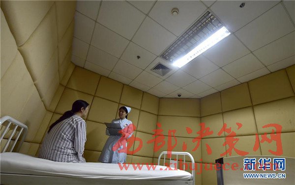 4月6日,一名護士(右)在發(fā)泄室了解抑郁癥患者的病情。