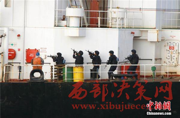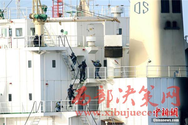圖為特戰(zhàn)隊員快速登入商船展開營救活動。