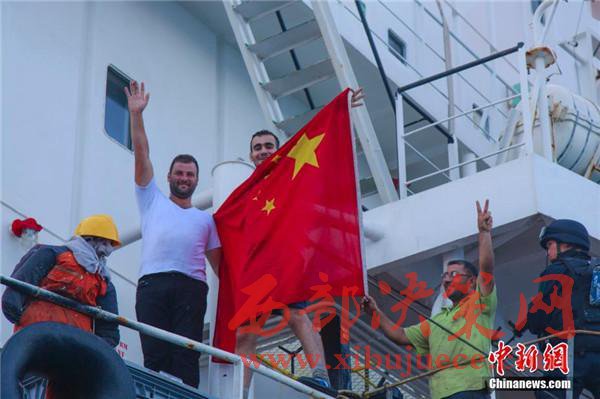 圖為船員獲救后,對中國海軍的營救表示感謝。
