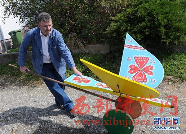 4月12日,在克羅地亞的比斯特里察,玩具制作者梅薩爾調(diào)試一件大型木制玩具。