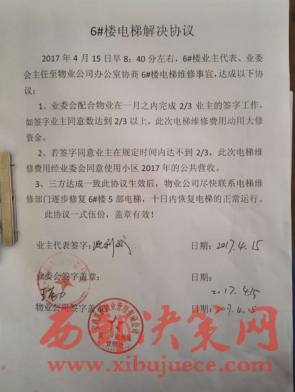 最新進(jìn)展:4月15日,業(yè)主委員會(huì)和凱躍物業(yè)達(dá)成維修協(xié)議,業(yè)委會(huì)配合物業(yè)在一月之內(nèi)完成2/3 業(yè)主的簽字工作,電梯維修費(fèi)使用大修資金。如果在規(guī)定時(shí)間內(nèi)達(dá)不到2/3業(yè)主簽字,則使用小區(qū)2017年的公共營收。三方協(xié)議達(dá)成后,由凱躍物業(yè)盡快聯(lián)系電梯維修公司,十日內(nèi)恢復(fù)電梯的正常運(yùn)行。