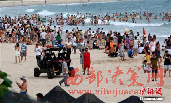 資料圖:2016年6月9日,海南三亞,大批當(dāng)?shù)厥忻窈陀慰驮诖髺|海海灘扎堆“洗龍水”過端午節(jié)。