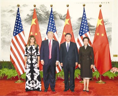 11月9日,國家主席習近平在北京人民大會堂東門外廣場舉行歡迎儀式,歡迎美利堅合眾國總統(tǒng)唐納德·特朗普對中國進行國事訪問。這是習近平和夫人彭麗媛在人民大會堂同特朗普夫婦合影。(記者 蘭紅光 攝)