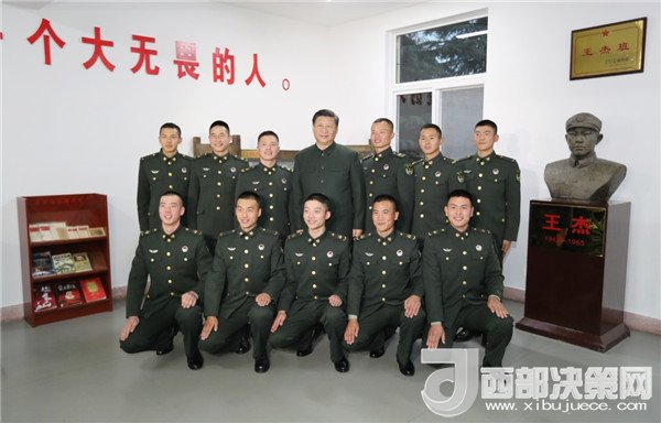 離開連隊(duì)榮譽(yù)室后,習(xí)近平來到“王杰班”。全班戰(zhàn)士列隊(duì)歡迎,習(xí)近平微笑著同他們一一握手?,F(xiàn)任班長王大毛向習(xí)近平介紹了戰(zhàn)士們爭做王杰傳人的情況。50多年來,連隊(duì)每天點(diǎn)名第一個呼點(diǎn)王杰??吹酵踅芫裨谶B隊(duì)得到很好傳承,看到尊崇英雄、學(xué)習(xí)英雄氛圍這么濃厚,習(xí)近平很欣慰。他招呼戰(zhàn)士們圍坐一圈,詳細(xì)詢問大家的學(xué)習(xí)、訓(xùn)練、生活情況,勉勵大家再接再厲,帶頭做新時代王杰式的好戰(zhàn)士。離開連隊(duì)時,習(xí)近平同全連官兵合影留念,指戰(zhàn)員們簇?fù)碇?xí)近平,充滿了幸福和喜悅。全連官兵齊唱連歌“王杰的槍我們扛”,表達(dá)了廣大官兵堅(jiān)決聽習(xí)主席的話、自覺做英雄傳人的堅(jiān)定決心。