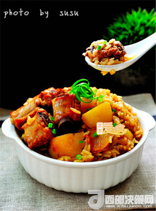 6.電飯煲或壓力鍋里米洗凈,放入適量水,將排骨連醬汁一起倒入,開煲。煮好后撒點(diǎn)蔥花,拌一拌就可以開吃了。