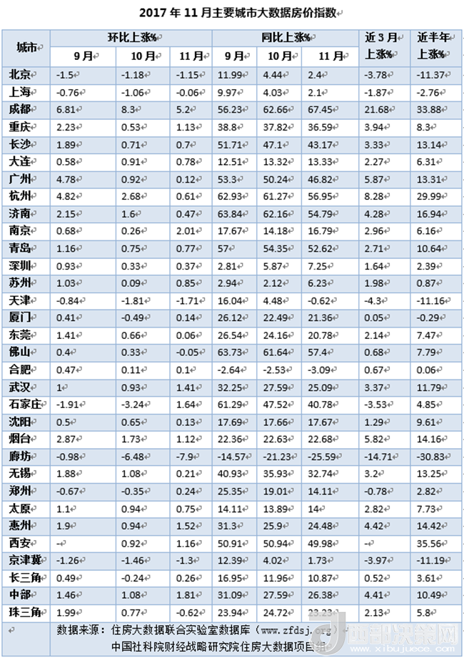 2017年11月大數(shù)據(jù)房價指數(shù)監(jiān)測發(fā)現(xiàn),一線城市房價全面停漲,其中北京、上海繼續(xù)下跌,環(huán)京板塊累計跌幅較大;二線城市中除了成都、南京等少數(shù)城市外房價均相對穩(wěn)定;熱點三四線城市如佛山、東莞、合肥、無錫等也趨于停漲。
