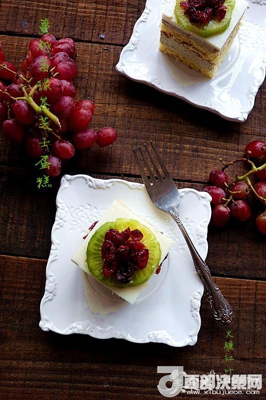 18蛋糕脫模切件,加放個(gè)人喜愛(ài)的水果片在蛋糕上,撒上用果汁泡軟的蔓越莓,即可食用