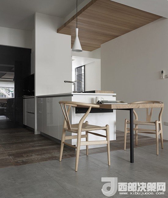 將洗手臺放在中間的位置,配上組合的簡易餐桌,不做吧臺的設(shè)計(jì)也能滿足開放式的需求,在家下廚較少的業(yè)主可以考慮。