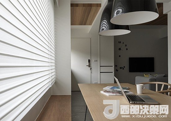 為了符合簡單純粹的設(shè)計(jì)理念,沒有電視柜的背景墻上放置了一個藝術(shù)時鐘,可移動的數(shù)字設(shè)計(jì)展現(xiàn)了一種道家的精神。
