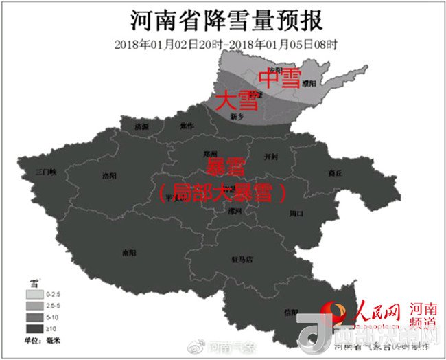 人民網鄭州1月2日電(戚藝芳)瑞雪兆豐年,河南將迎2018年首場強降雪。據河南省氣象臺最新消息,從2日夜間河南將開啟暴雪模式!-12℃+5級大風+25cm積雪,可謂是入冬以來范圍最大、強度最強的降雪過程。
