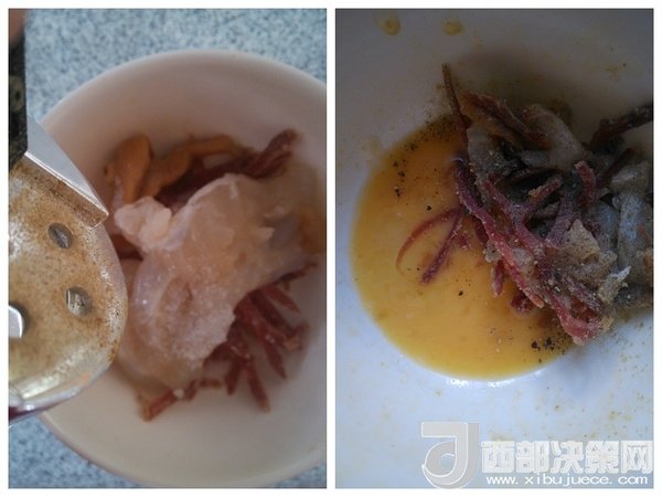 2、加點(diǎn)食鹽和雞粉揉勻之后腌制半個(gè)小時(shí);