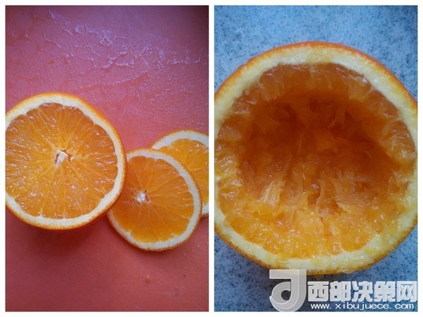4、比較大的一半橙子挖去其中二分之一厚度的橙子肉;