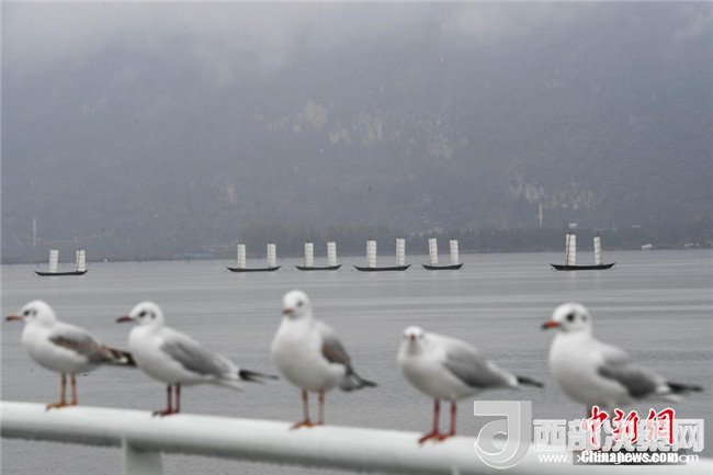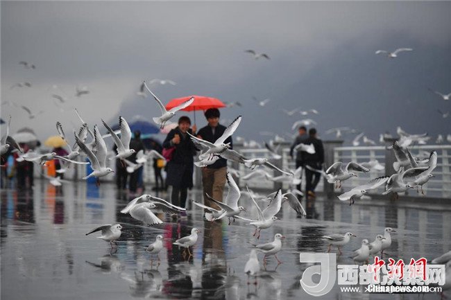 昆明滇池游客雨中邂逅紅嘴鷗