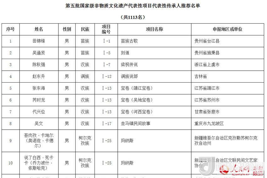 在各地推薦申報(bào)的基礎(chǔ)上,各評(píng)審組專家對(duì)全國(guó)31個(gè)省(區(qū)、市)、新疆生產(chǎn)建設(shè)兵團(tuán)、中央有關(guān)部門及港澳地區(qū)推薦的申報(bào)人進(jìn)行了評(píng)審,經(jīng)評(píng)審委員會(huì)審議,提出了第五批國(guó)家級(jí)非物質(zhì)文化遺產(chǎn)代表性項(xiàng)目代表性傳承人推薦名單(共1113人)。其中對(duì)尚未認(rèn)定過(guò)國(guó)家級(jí)代表性傳承人的項(xiàng)目,本次推薦827人,對(duì)已認(rèn)定過(guò)國(guó)家級(jí)代表性傳承人的項(xiàng)目,本次推薦286人。