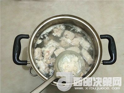 4.排骨涼水下鍋,水沸后撇去浮沫撈出備用。
