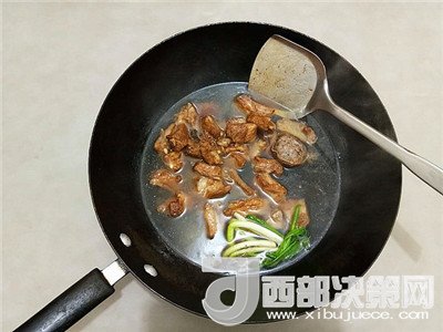 5.鍋中放少許油,放入焯過水的排骨稍微炒一下,放入生抽、老抽、冰糖、燉肉料包、生姜、香蔥等調(diào)料